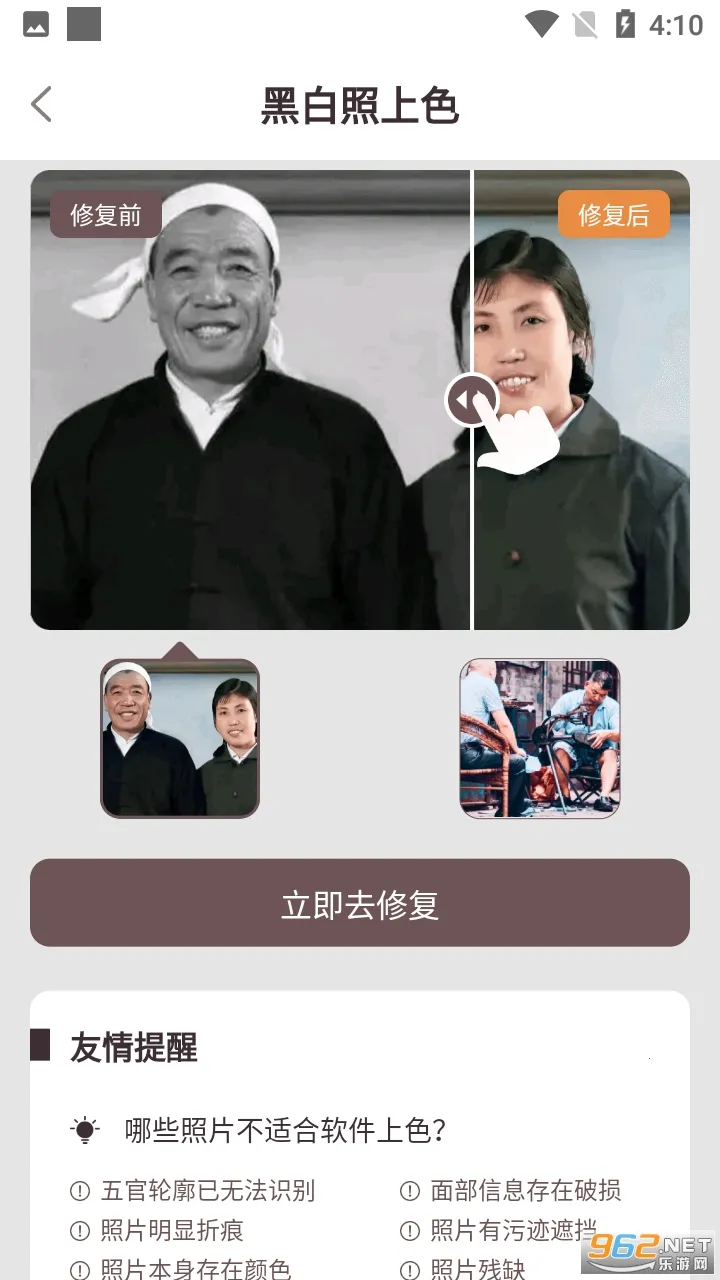 2. 功能体验:具备智能上色、无损放大、修复破损、添加特效等全面功能,能满足不同需求。