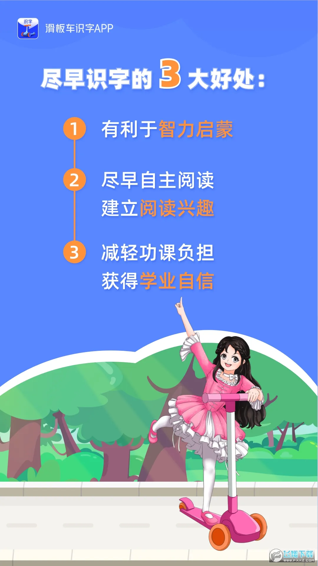 滑板车识字安卓版是专为3-8岁儿童设计的识字启蒙软件。有海量字库,三步学习法,科学复习与进度追踪。通过趣味化学习,助孩子轻松识字,实现幼小衔接,家长可随时了解学习情况,多台设备可同步进度。