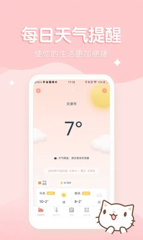 如果你想知道喵喵实时预报天气怎么设置,那这款软件绝对能满足你。它是一款超棒的手机天气预报软件。功能超强大,能实时播报天气,气温、雨雪一目了然。还有自然灾害预警、风力预警、温度预警等。能精准预测未来15天天气,实时更新。还能关注远方的TA,掌握全国各地天气。特色也不少,可在app内记录每天行程,有今日日程记录功能,生活诸事轻松记录。还有万能工具箱,生活工具一应俱全。每日天气提醒,让生活更便捷。界面清新可爱,有指南针功能,是出门定位好帮手。不仅能查看每天天气,还能了解温度、湿度、空气质量等数据。不同城市划分细致,一键快速切换城市,覆盖全国各地,出行更省心。语音播报天气,解放双眼,特别适合老人。有了它,轻松设置,随时掌握天气变化,生活更方便。