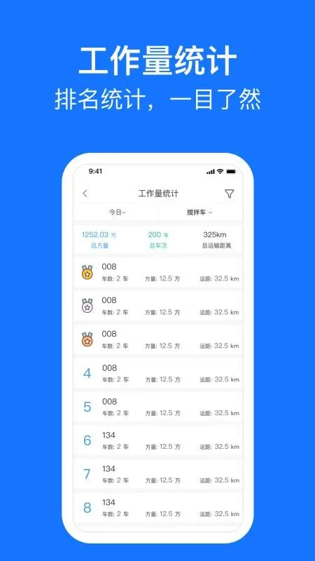 3. 工作量统计清晰,能有效统计搅拌站工作量,查看排名。