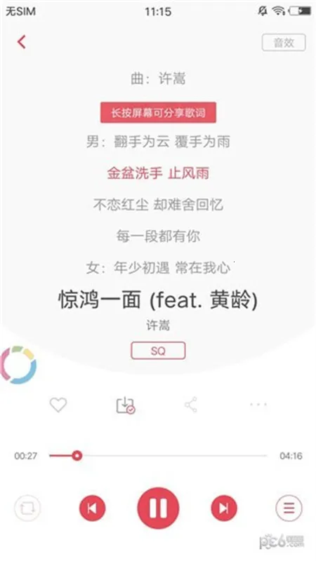 3. 支持歌词实时滚动显示,并跟随音乐播放进度自动高亮当前句子,跟唱超方便。