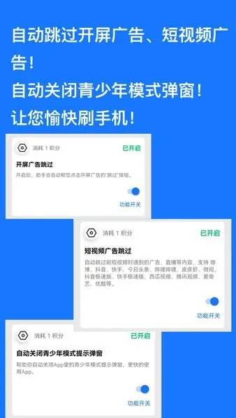 1. 全自动识别各类应用启动广告,精准点击跳过,秒速进入软件。