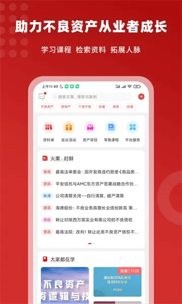 火栗网是四大AMC团队创办的不良资产行业信息门户平台,有35万用户。整合资讯、课程、人脉等服务,覆盖全领域。功能包括新闻推送、圈子交流、课程报名等,助力从业者提升能力、拓展资源。