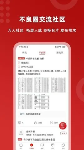 2. 建立以用户为核心的不良资产行业社区,方便发布对接业务需求,拓展人脉与业务关系。