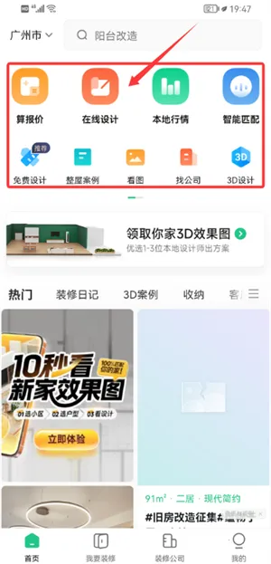 1、启动软件后,首页提供算报价与在线设计功能,支持搜索阳台改造等关键词。