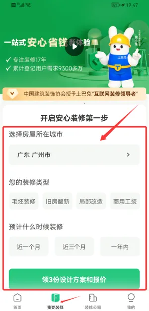 2、切换至我要装修页面,依次选定城市、装修类型及预计施工时间。