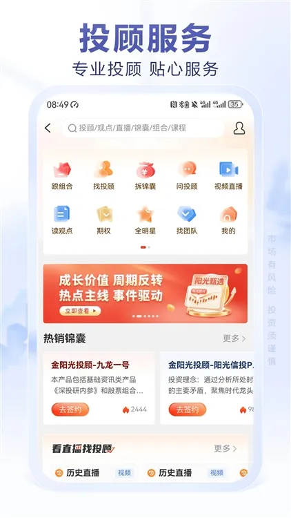 3. **理财推荐**:精心打造理财商城,金牌理财团队从众多产品中定期精选10只明星产品,供用户参考选购。