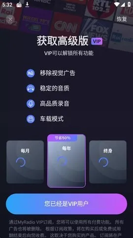 MyRadio2026最新版本是一款收音机App,解锁高级版无广告。能收听超五万多个来自世界各地的网络广播,内容类型全,音乐风格多样。手机联网即可切换,支持线上与FM,还有离线收听、实时录制等特色功能。