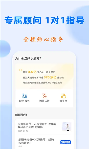 水滴筹是水滴公司推出的医疗类公益互助平台,为重疾患者提供1对1筹款指导。0手续费,最高可筹50万。操作简便,审核严格,款项可随时提现。汇聚爱心,助患者减轻压力,让公益更便捷高效。