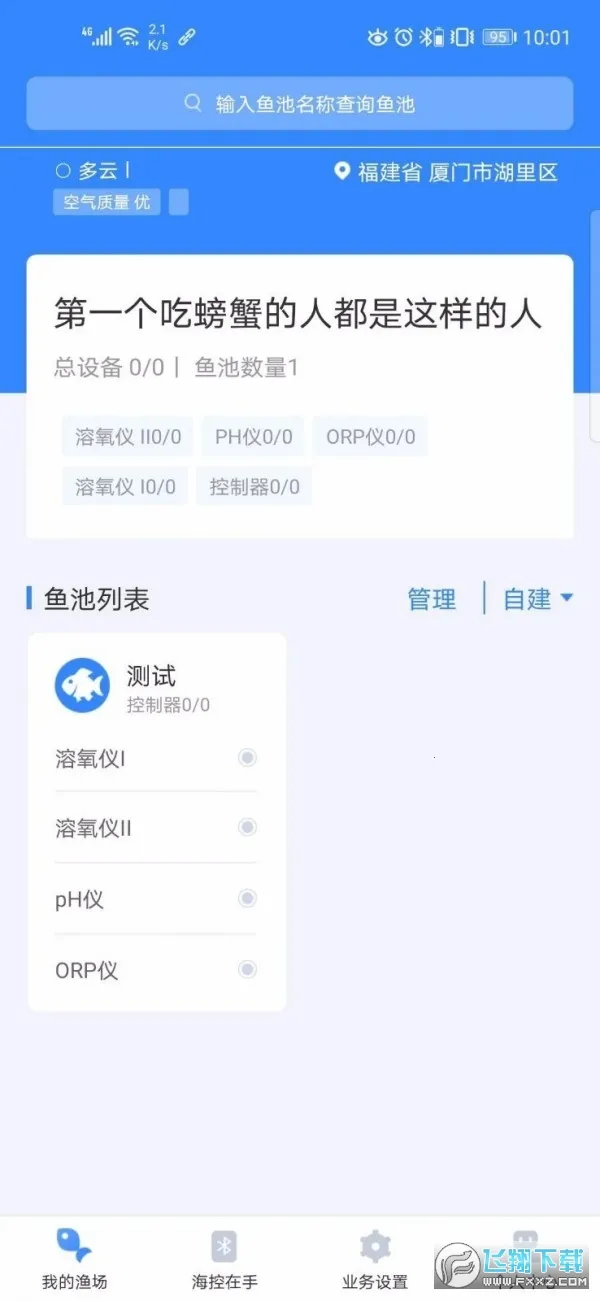海控物联app是专为水产养殖业开发的软件,有水质测控和智慧养殖两大模块。能实时监测水质、控制设备,记录养殖事件与分析效益。可添加管理设备,蓝牙连接方便,还有多板块功能助力智慧水产养殖。