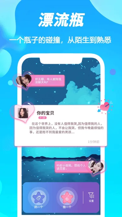 1. 以漂流瓶为核心玩法,支持文字、语音、视频等多种互动形式,满足用户倾诉心事、结识好友甚至脱单的需求。