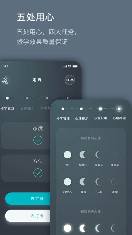 2. 它将修行课程统一记录,四大任务让修行效果更好,数据记录更完整,让用户清楚个人修行状态。