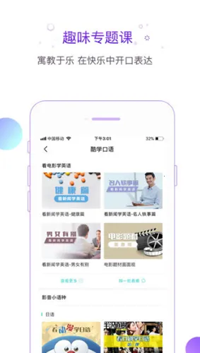 4. 美音英音都有,海量学习资源,讲练一体,训练场景丰富,趣味专题课能让人在快乐中学会表达 。