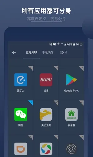 双开大师最新版可在同一手机多开微信、QQ、淘宝等常用应用或游戏账号,运行流畅不占过多内存。有个性化自定义选项,支持福利专区领红包,独特内存管理机制确保平稳运行,是提高效率简化生活的理想选择。