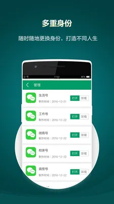 1. 免费应用双开,微信双开体验与官方一样,支持大小号同时在线,收发消息流畅不延迟。