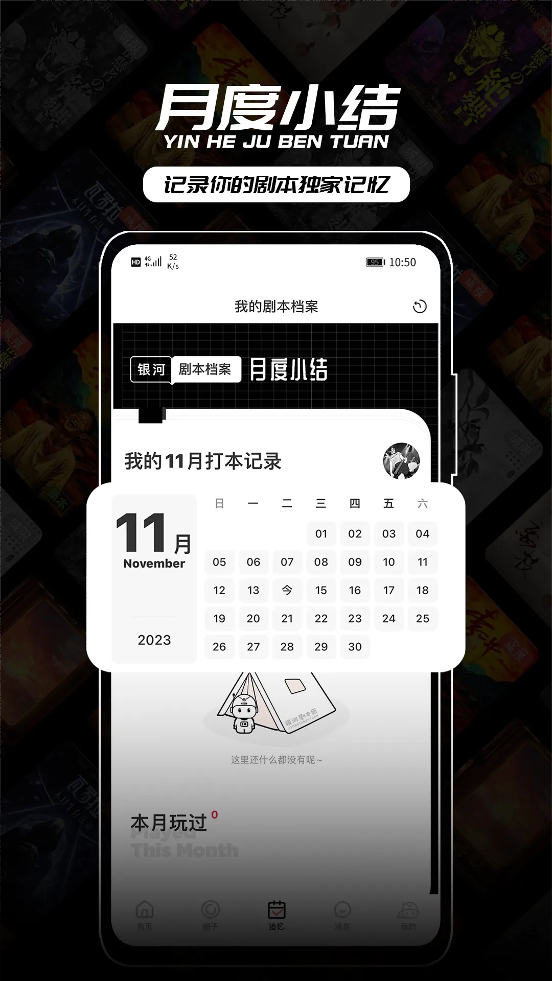 银河剧本团是沈阳市套路少一点网络科技有限责任公司打造的线上剧本杀社交平台。有海量剧本,类型全,每周精选推送。支持同城组局、找附近店铺,还有话题广场、分享动态等功能,能语音连麦轻松玩。