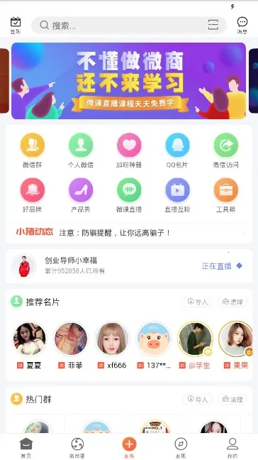 2. 功能丰富实用,如一键生成个人名片、展示群名片、推荐优质品牌、提供海量商品展示区及专业微商课程等。
