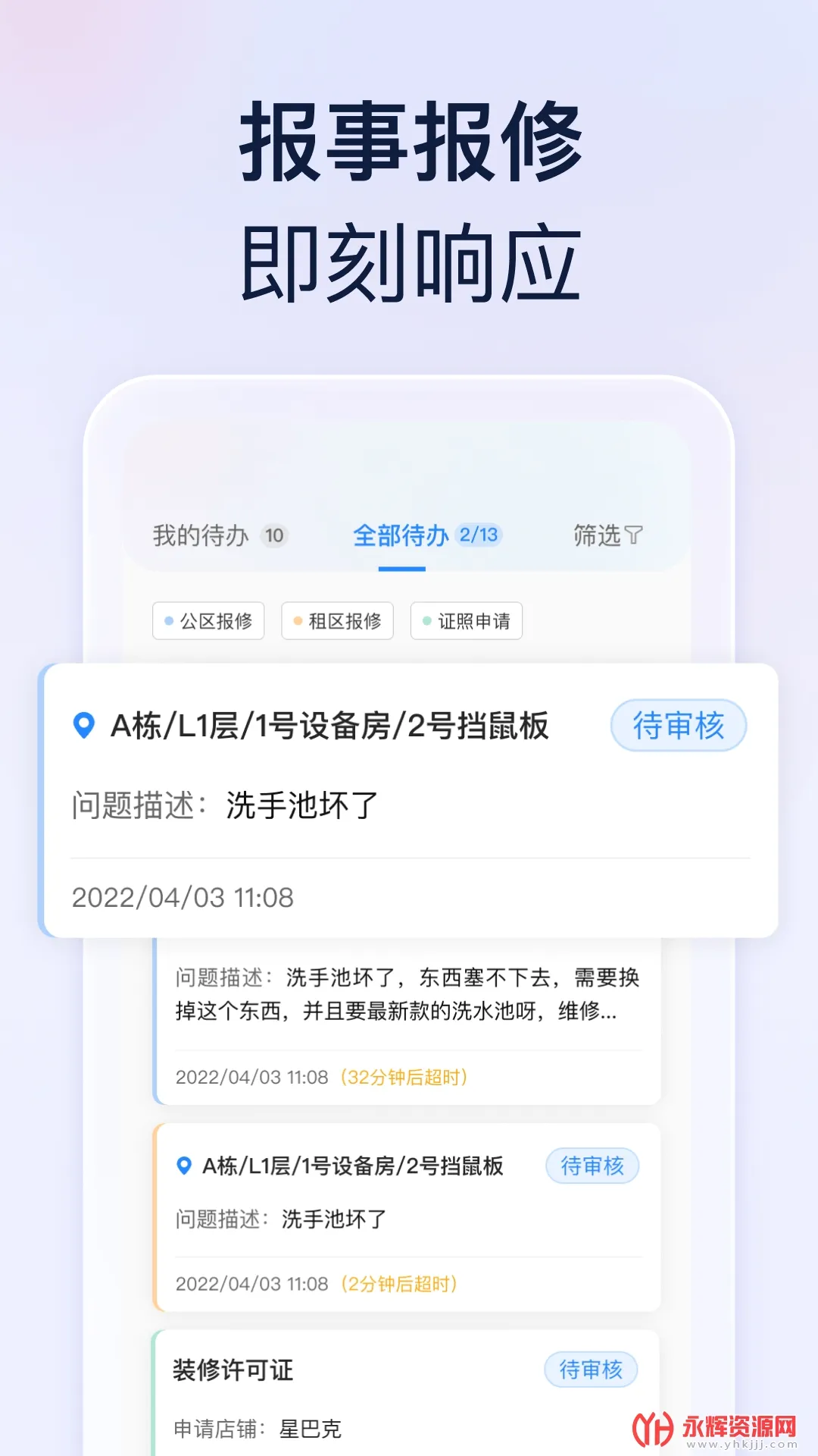 3. 报事报修即刻响应,计划任务让工作更轻松,证照办理让复杂变简单。