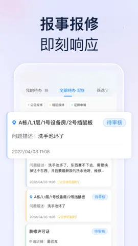 1. 操作方便快捷,能即时响应报事报修,让物业员工更好地处理业务事务。