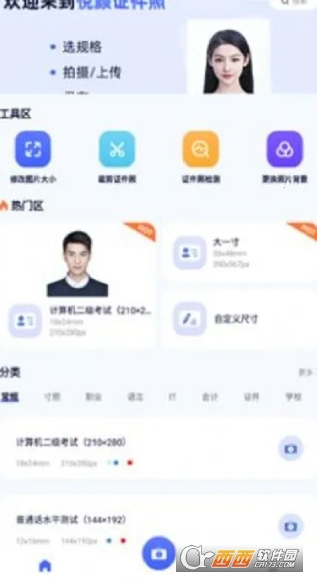 2. 包含常见证件照尺寸及各种场景规格模板,如1寸2寸、护照签证,还有四六级、教资考试、职业形象照等模板。
