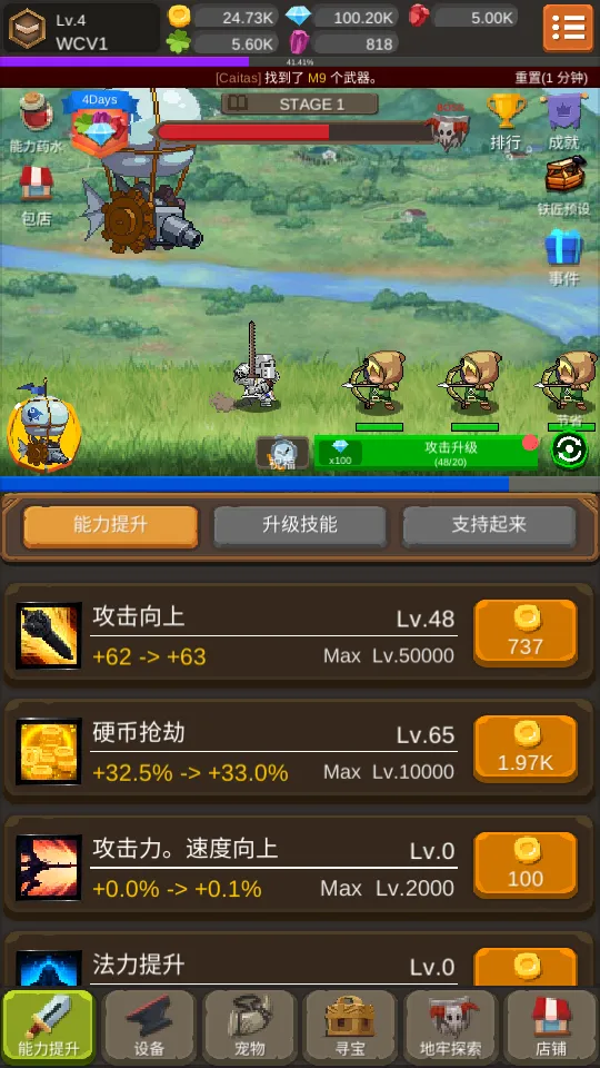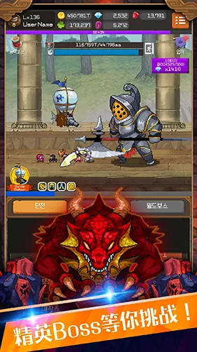 4. 像素风格独特,以高位像素构建色彩斑斓世界,带来怀旧视觉体验。游戏操作简单,通过点击就能进行角色升级等,无需复杂操作。初始阶段有大量钻石,获取装备轻松,体验舒适有趣。