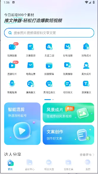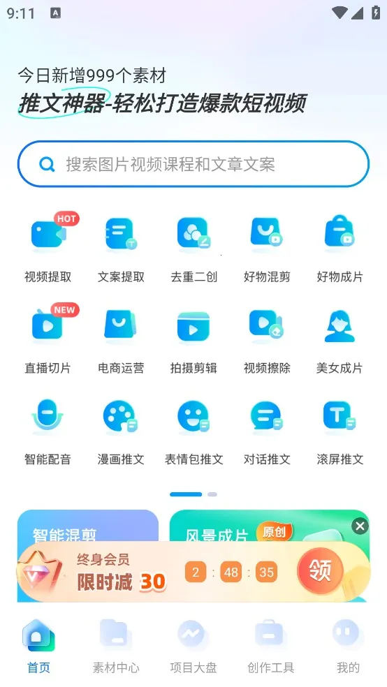 2. 效率提升:AI 文案与一键成片功能显著缩短创作时间,利用全新 AI 技术自动生成多种文案,输入关键词或选模板就能快速生成原创视频,大幅提高内容生产效率。
