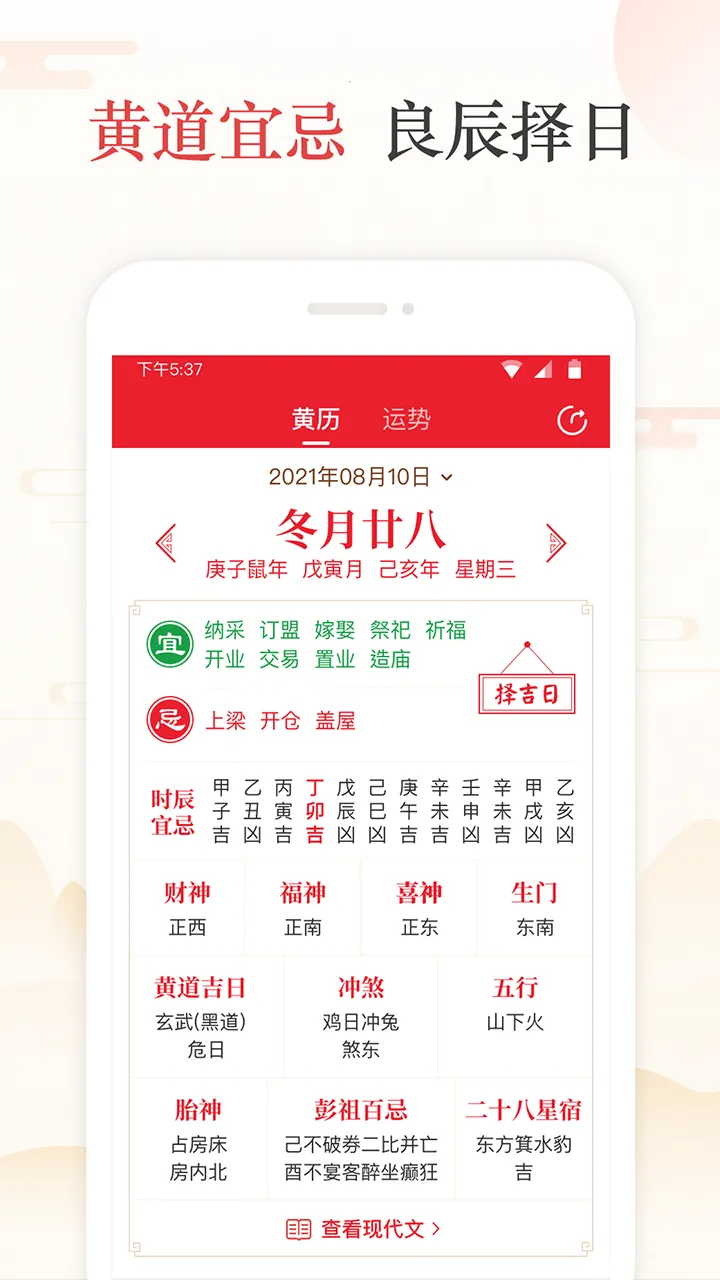 1. 以中国传统万年历为核心,融合黄历、节日节气等传统文化元素,延续中国传统文化。