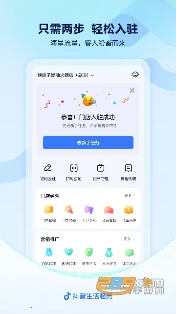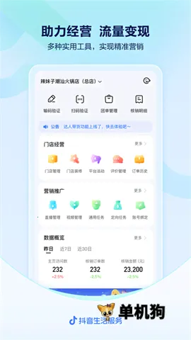 抖音来客商家版是抖音官方推出的本地商家经营平台,能帮商家实现门店信息管理、团购上架、营销推广、经营结算等全流程功能,依托抖音庞大流量,助商家轻松线上经营、快速收益。