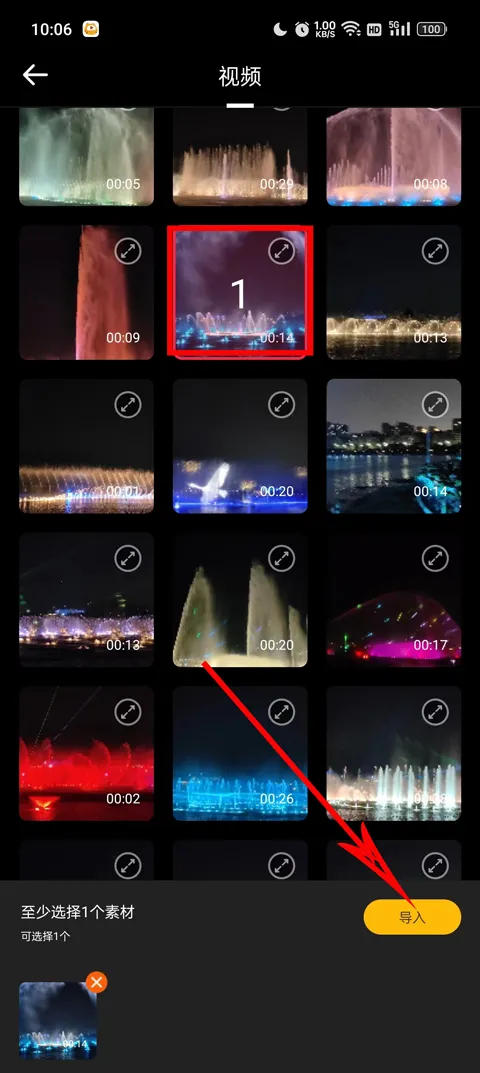 2、首先进入到视频剪辑,在相册中导入一个素材,选择后进入导入;