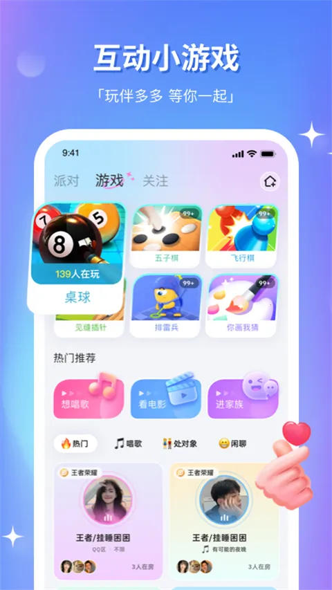 4. 功能玩法多样:有聊天室、连麦互动、热聊大厅、语聊交友、趣味游戏等多种玩法,还能自由组CP,记录情感之路。