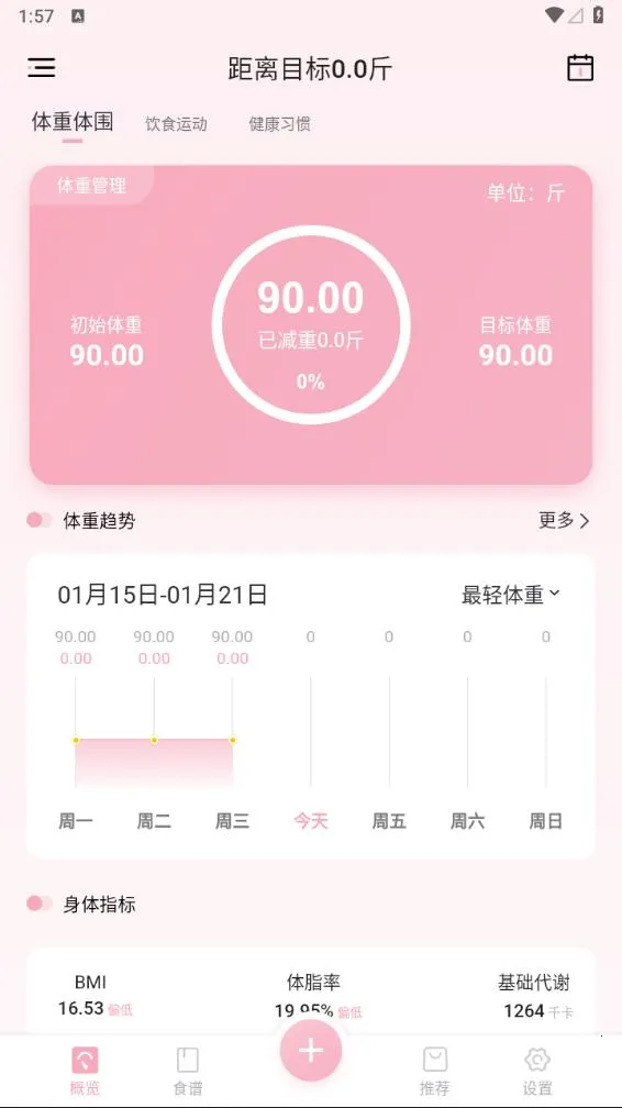 4. 展示方式多样,有体重列表、柱形图、趋势线、百分比圆环等,支持每日多条体重记录并可自定义标签,还能生成清晰趋势图。