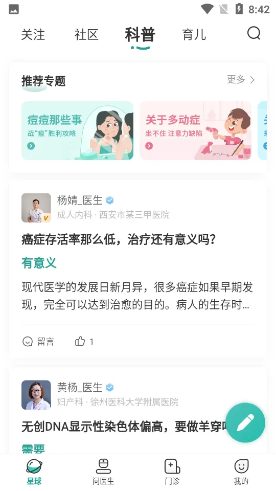 2. 免费提问不限量,怡禾星球所有问题由认证医生、药师、营养师等回答,审核后公开发布,还有科普文等。