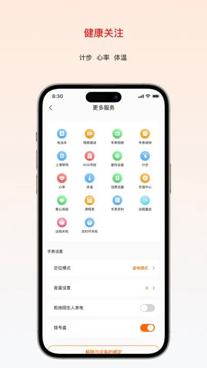 3. 便捷交互:首次使用几步操作就能快速绑定手机与手表,全程图文引导,新手易上手。绑定后首页集中呈现关键信息,支持高清语音和双向视频通话。
