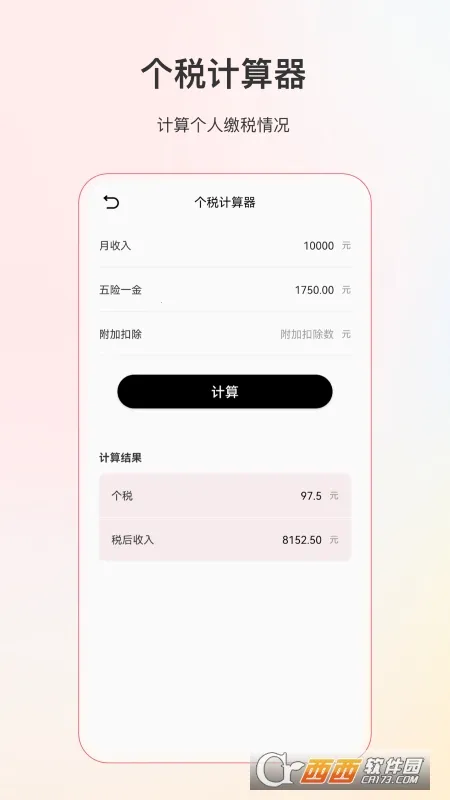 2. 个税结果清晰展示,点击计算即可得到个税金额、税后收入等核心结果,信息一目了然,适合发薪前自查与预算规划。