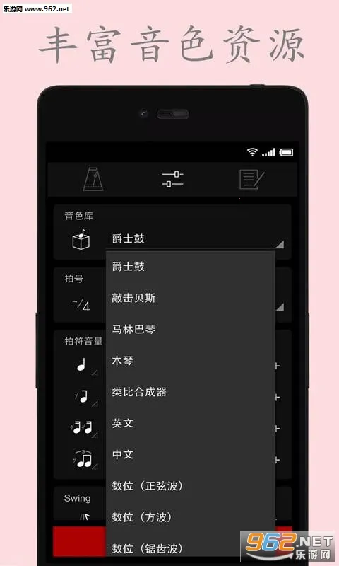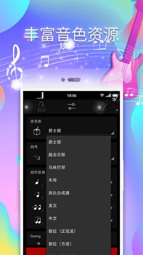 1、支持多种不同的音色选择,爵士鼓、敲击贝斯、电子合成器等中英文音色应有尽有。
