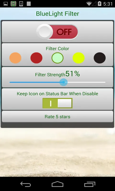 它的便利性更是没得说。开启后能显著降低屏幕亮度,让光线更柔和,减少视觉刺激。有效过滤有害蓝光,保护视网膜。屏幕光线温和调节,夜间使用超舒适。软件体积小巧,不占系统资源。提供5种滤镜颜色可选,支持强度实时调节,适应不同环境和个人偏好。运行稳定,几乎不影响手机续航。还能通过通知栏迅速调整过滤设置,操作简单又方便,真的是一款不可多得的护眼好软件。