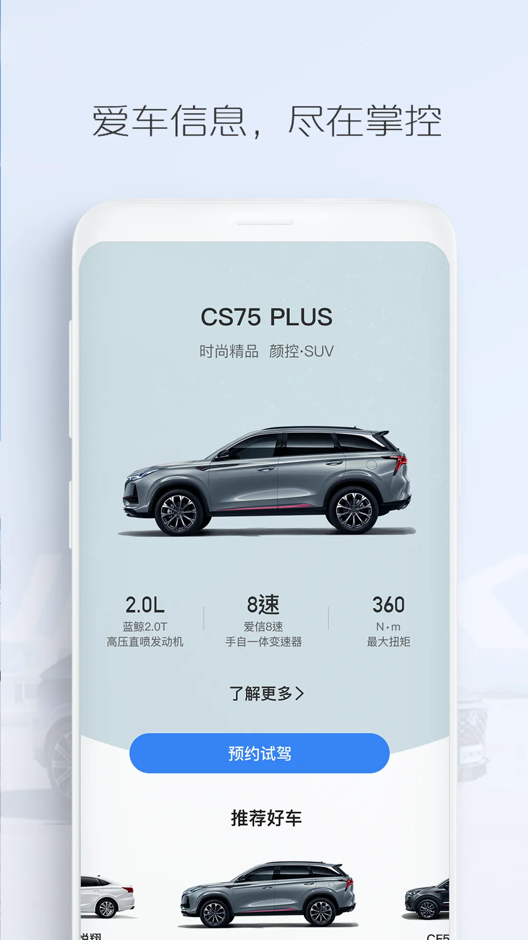 2. 随时掌握汽车前线的各种信息,手机可在线预约长安汽车软件,让预约爱车更方便。