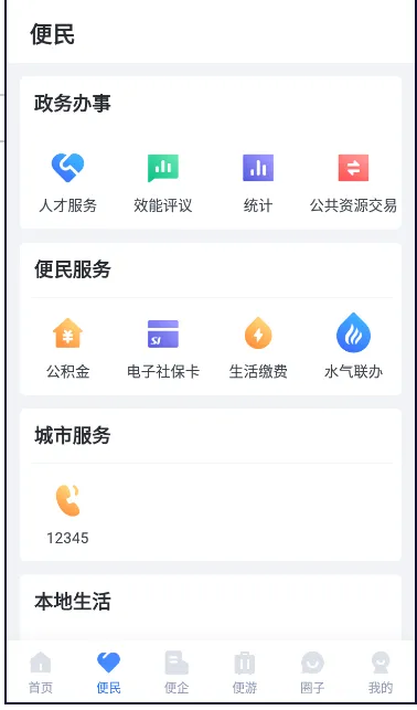 3. 便民服务包含定点医院、定点药店以及生活缴费。