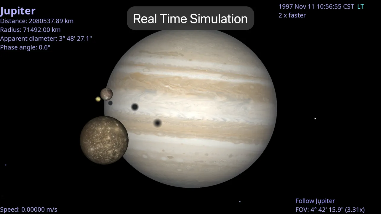 4. 通过滑块自由调整时间流速1x至1e6x,直观演示日食、卫星过境等天文现象。