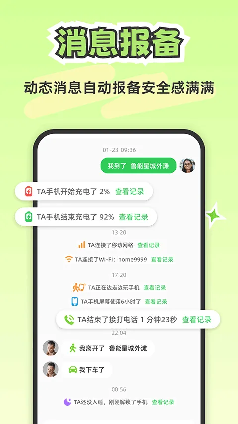3、自动报备功能贴心,对方上车下车、离开或到达任意地方时,都会自动发送报备消息。