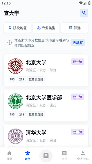 2. 智能推荐院校专业。输入高考分数、省份及选科情况,系统自动生成适合的院校与专业推荐,助考生找到合适志愿组合。