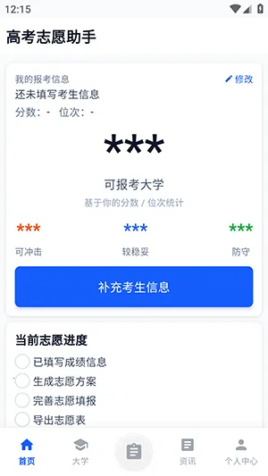 1. 智能志愿规划,输入基础信息,系统自动生成冲稳保志愿组合,让志愿填报更合理。