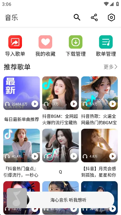 海心音乐 2025 最新版本是免费音乐播放神器,曲库庞大,涵盖多风格流派且更新及时。具备高清音质、音效调节等功能,支持离线下载、歌单创建,界面简洁,能依习惯推荐音乐,满足多样听歌需求 。
