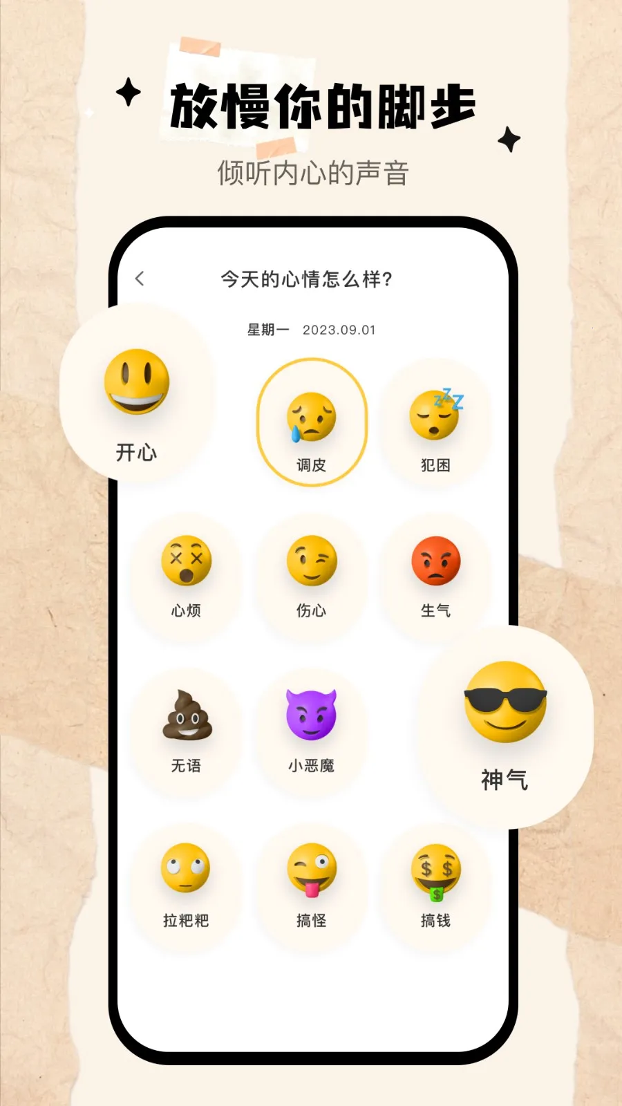 1、独创心情转盘设计,可直观表达每日情绪,留下独特情感印记。