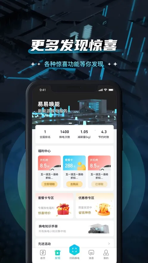 4、优惠活动多样,全新上线付费券包,券种组合丰富,性价比高,还有积分奖励、能量包等多样优惠,满足换电需求。