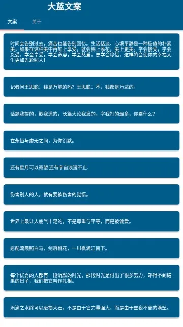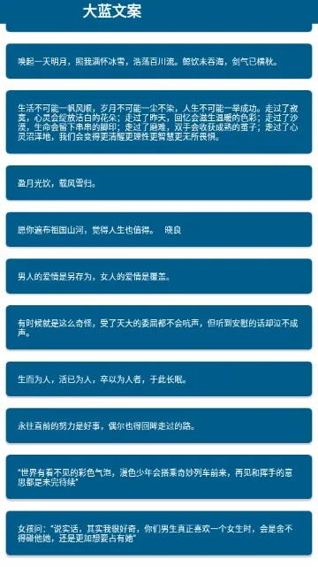 大蓝文案2025最新版本是一款娱乐文案软件。有上百万条免费文案,分类细致,搜索强大,支持一键复制。还新增九宫格图片批量保存等功能,海量文案助你解决发圈等文案难题 。