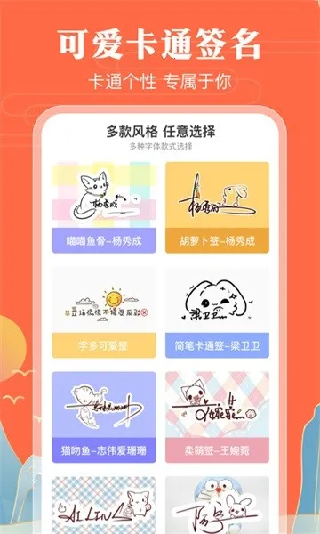 1、风格字体多样:涵盖霸气潇洒的总裁签、商务签等,也有可爱软萌的可爱签、卡通签等,还有文艺风格,满足不同展示需求,上百种签名字体任你挑选。