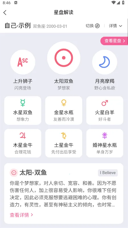 3、专业且全面:实现了多种星盘功能,单人星盘覆盖本命盘、行运盘等绝大多数星盘,双人星盘也有对比盘、组合中点盘等,还对各种盘做了详细解读,涵盖现代和古典参数。