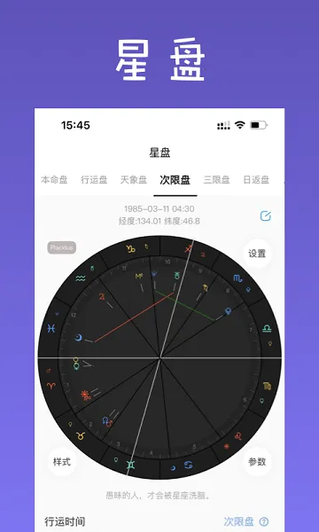 4、功能设置多样:有专业的星盘工具,用户可对星盘参数在线设置,选择喜欢的星盘样式皮肤,还能设置不显示星盘下方的格言等;支持星盘格局计算,有开放性合盘缘分评分功能;软件按星盘行星宫位相位分区提供功能分类专区,用户可按需选择使用。