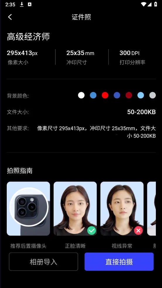 2、功能实用且灵活:提供多种标准证件照底色,支持一键切换并实时预览;内置详细拍摄指南,帮助用户拍出符合标准的素材;整合多种尺寸模板,支持自动裁剪和手动微调;还能从本地相册导入存量照片作为素材,提升使用灵活性。